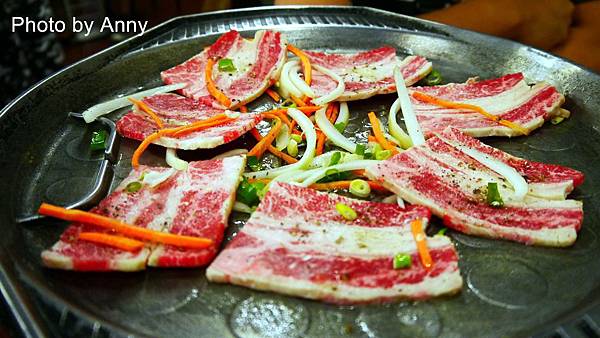 鐵盤烤肉的豬五花肉與牛五花肉~看這些五花的顏色多美呀~就像一朵鮮豔的花~