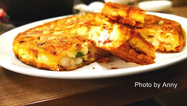 為了體驗不同的韓式美食,所以我們點餐時,點了這一份含海鮮煎餅吃看看,看這份厚厚的煎餅裡面海鮮料還真的蠻多的,不是只有麵粉而已喔~