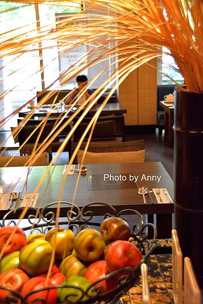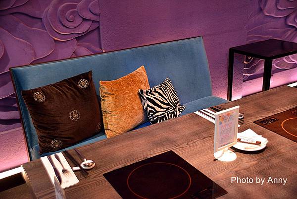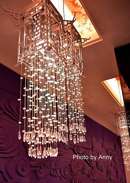 這裡的用餐區由中間的餐檯劃分為兩個區域,前面的區域有一大面窗戶是靠著外面走道,可以看到外面的楓樹;而裡面用餐區則是有一大面紫色的牆壁裝飾,搭配這垂釣著水晶燈,整個呈現就是華麗的風格~