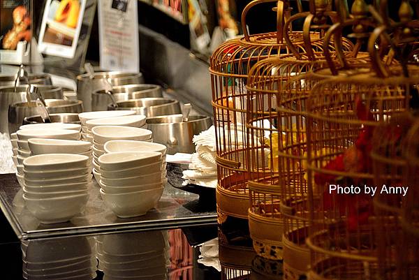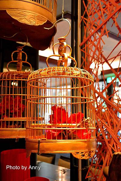 餐台上的一些裝置藝術~現在這些鳥籠都不裝鳥而裝花了!阿~這就是藝術呀~