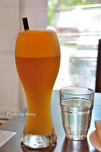 這是小跟班點的百香果汁(由室內往外拍,可以看到外面的綠意,但是杯內的飲料就呈現比較黯淡的效果~)