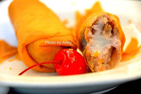 送上來的是剛炸好的芋頭麻糬酥~外層像是炸春捲的皮,裏頭的餡料芋頭好甜好香,還有麻糬的黏稠感裹著芋頭香,那層層的口感吃起來真是過癮呀!