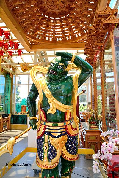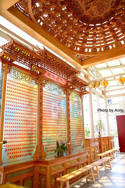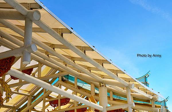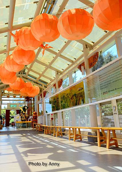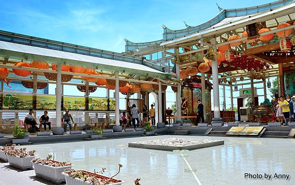 抬頭看~以前看到的廟宇都是用木頭當樑柱,這裡是用鋼骨當樑柱,屋頂用玻璃蓋的,透光性超好,可以省下很多的電費~