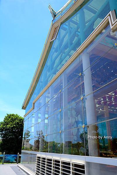 走出側門看看廟宇的牆壁,用玻璃做的玻璃牆,看起來真的很有科技感!看這被反射出來的藍天景象好清澈明亮,好像是水中倒影般的夢幻~