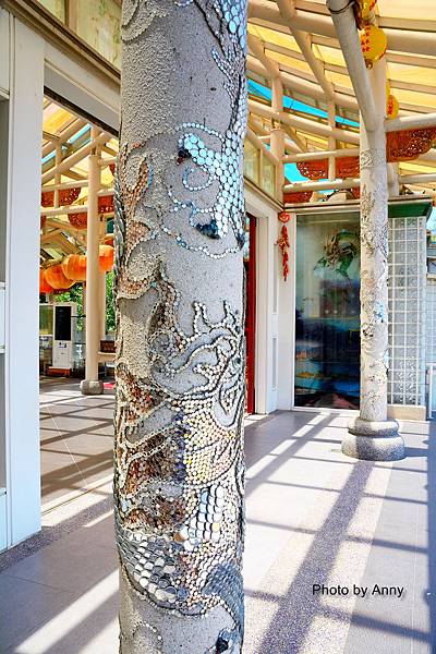 這些建築跟傳統的廟宇龍柱就真的不相同,看那龍柱沒有雕刻,只有用閃閃發光的玻璃,所拼貼而成的龍鳳畫作~