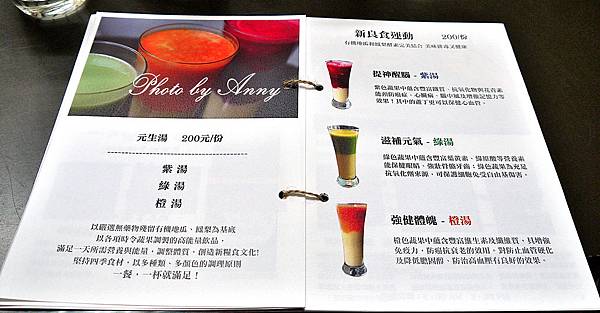 元生湯應該就是俗稱的"精力湯",有紫湯,綠湯,橙湯,裡面都有一些食物對身體的益處的說明,看到這樣的層次好漂亮,所以當天我就點了綠湯來喝看看~