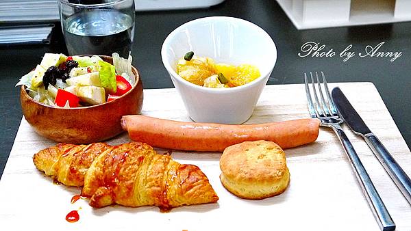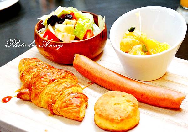 喜歡這樣清爽的擺盤,這早午餐內容有生菜沙拉,還有一盤水果,可頌麵包,德國香腸和一個司康,外加一杯元生咖啡.