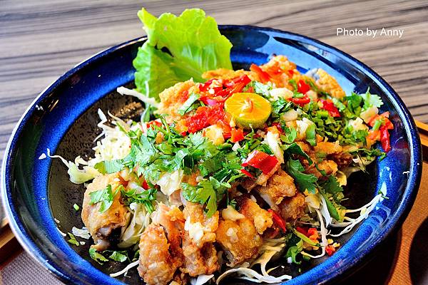 酸辣椒麻雞看到雞排上面這樣紅紅綠綠的配菜,視覺是很豐富!吃起來的口感也很豐富!因為很酸~哈~哈~