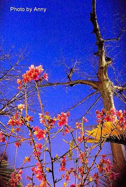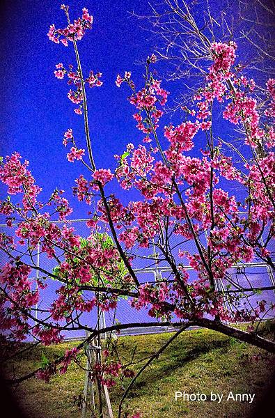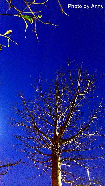 這一天傍晚時分在萬壽公園走路散步,運動完之後天色漸暗,剛好這一天的色溫很棒,可以看到湛藍的天空,此時趁機拿出手機來拍天空;不過突然想到這裡也有櫻花盛開,不如就來個天空與櫻花的合照吧。