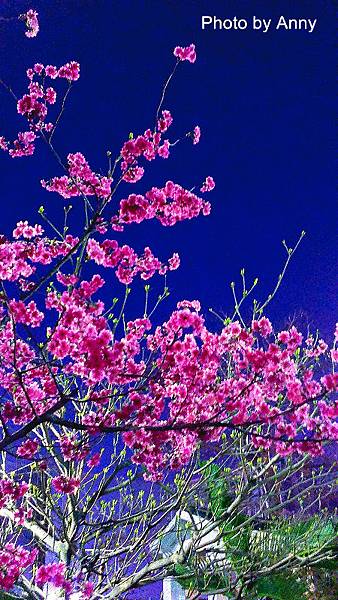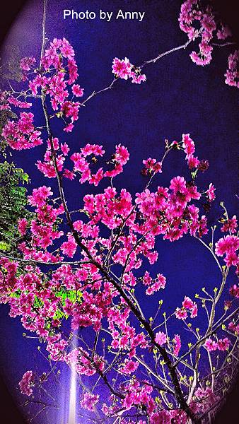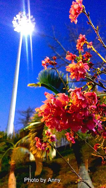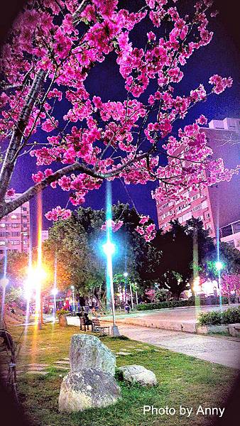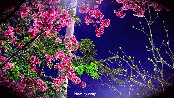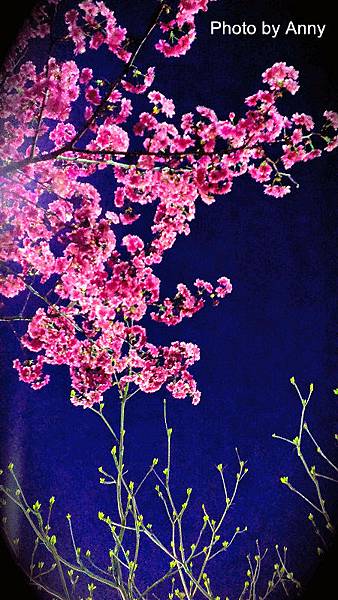 藍色的色溫很快就消失,不過還好有照明燈照亮這櫻花,也把這背後樹上的嫩芽照得更透亮!