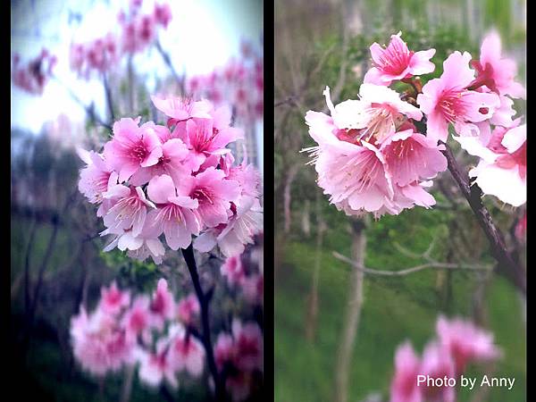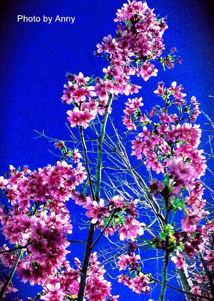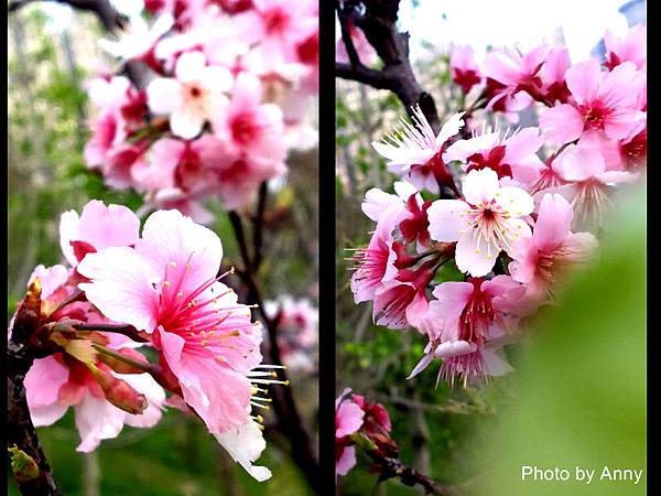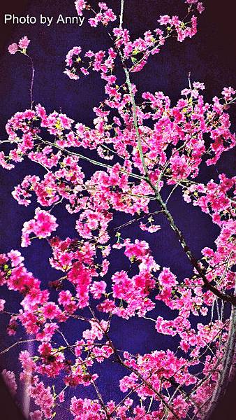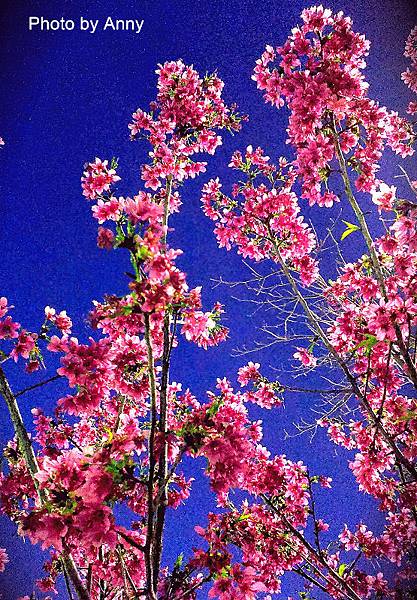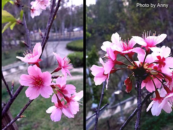 走道旁有幾棵粉紅的河津櫻,則花朵高高在上,很難近觀到它的風姿,花朵也比較小;不過我很幸運,看到山坡上有一棵櫻花盛開,雖然不是很茂密,但是這花朵可以跟它很親近的接觸耶~