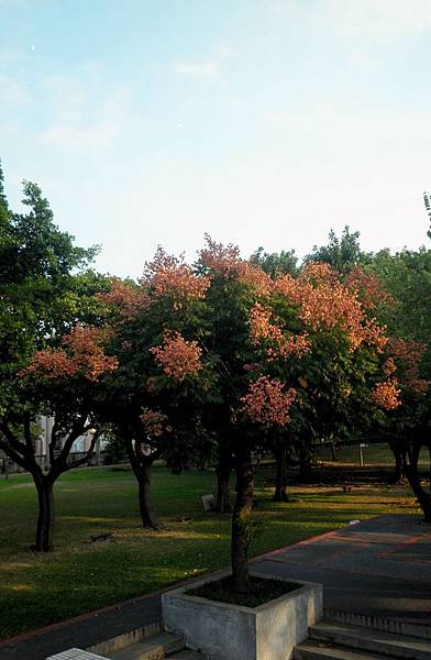 午后陽光斜斜柔柔的照在樹梢及公園草地上~這光影真是漂亮~