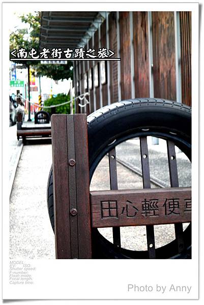 先在這車站旁停好車,開始我們的老街之旅,首先看到的是類似等車的候車室(但是...可等不到車喔~),地上放了一個鎖住的台車,我認為它很像小時候在鄉下的香菇寮裡,載運香菇的車子,所以感覺並不陌生,只是這個輕便車是以前人們用來載人或載物的交通工具。
